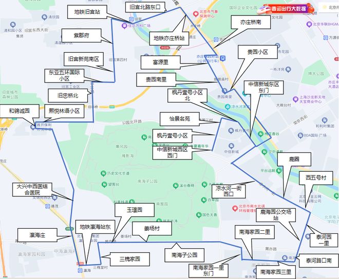外环:中信新城西区西门、枫丹壹号小区、怡景名苑、枫丹壹号小区北、中信新城东区东门、贵园小区、贵园南里、富源里、亦庄桥南、地铁亦庄桥站、旧宫北路东口、地铁旧宫站、紫郡府、旧宫新苑南区、东亚五环国际小区、旧忠桥北、熙悦林语小区、和锦诚园、大兴中西医结合医院、瀛海庄、地铁瀛海站东、三槐家园、玉璟园、姜场村、南海子公园、南海家园一里东门、南海家园二里、南海家园三里、泰河路口南、鹿海园公交场站、泰河园一里、西五号村、鹿圈、凉水河一街西口、中信新城东区东门、枫丹壹号小区北、怡景名苑、枫丹壹号小区、中信新城西区西门。
